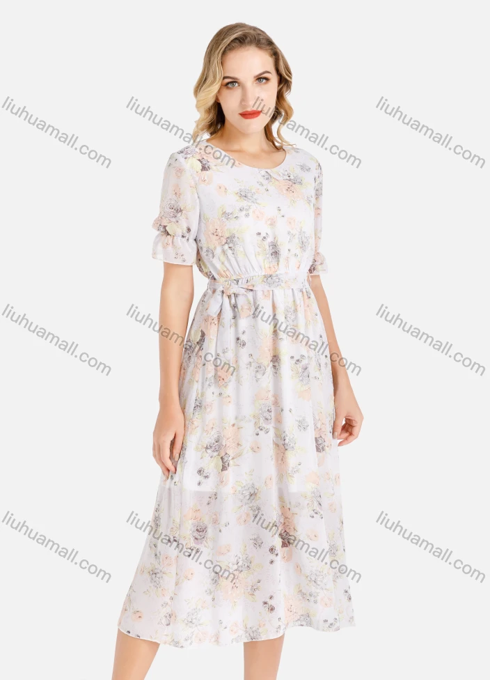 Wholesale Women's Casual Floral Print Round Neck Short Sleeve Tie Front Ruffle Hem MIdi Dress With Belt