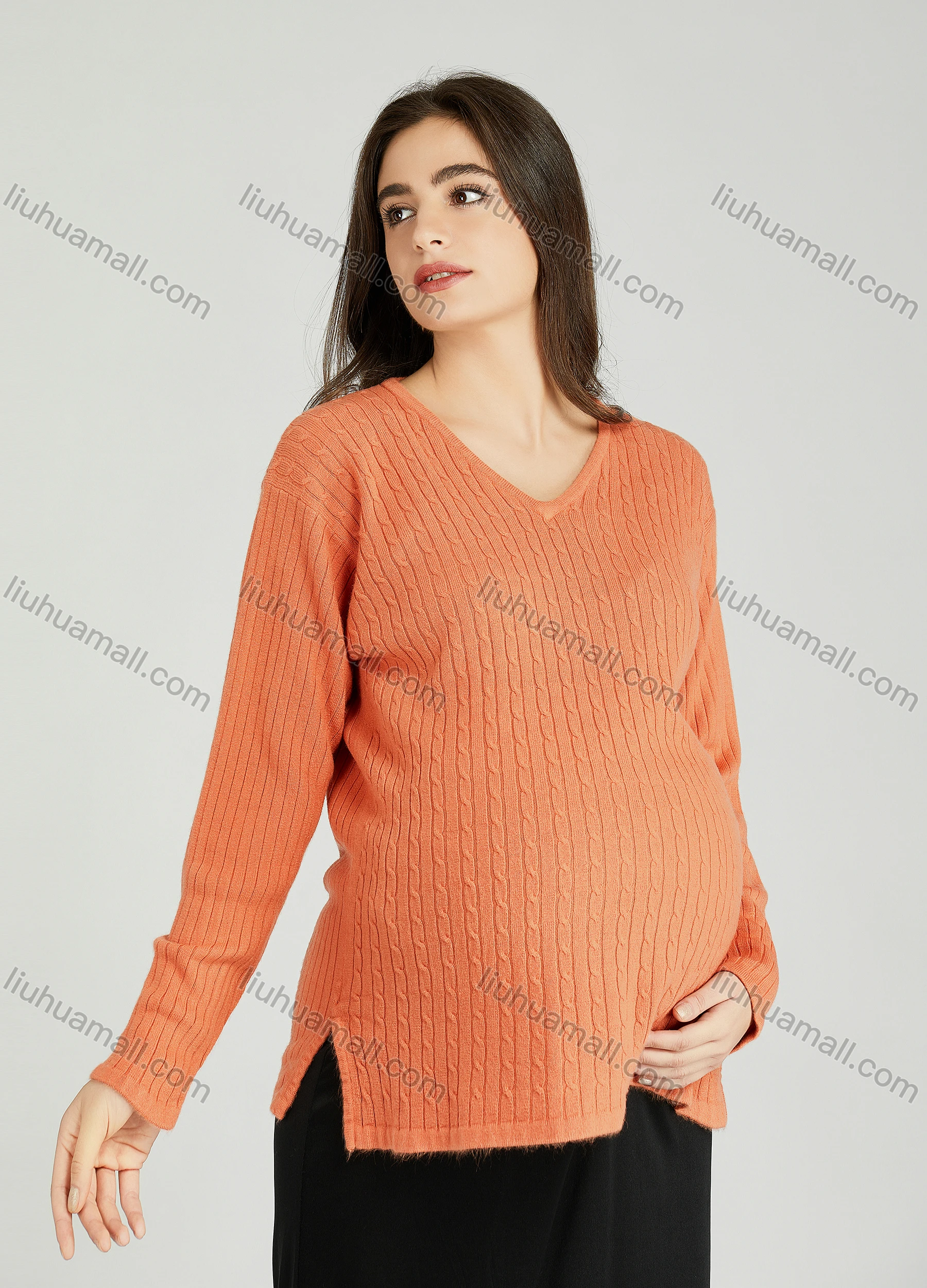 Wholesale Casual Plain V Neck Side Slit Long Sleeve Cable Knit Maternity Sweater HB1070#