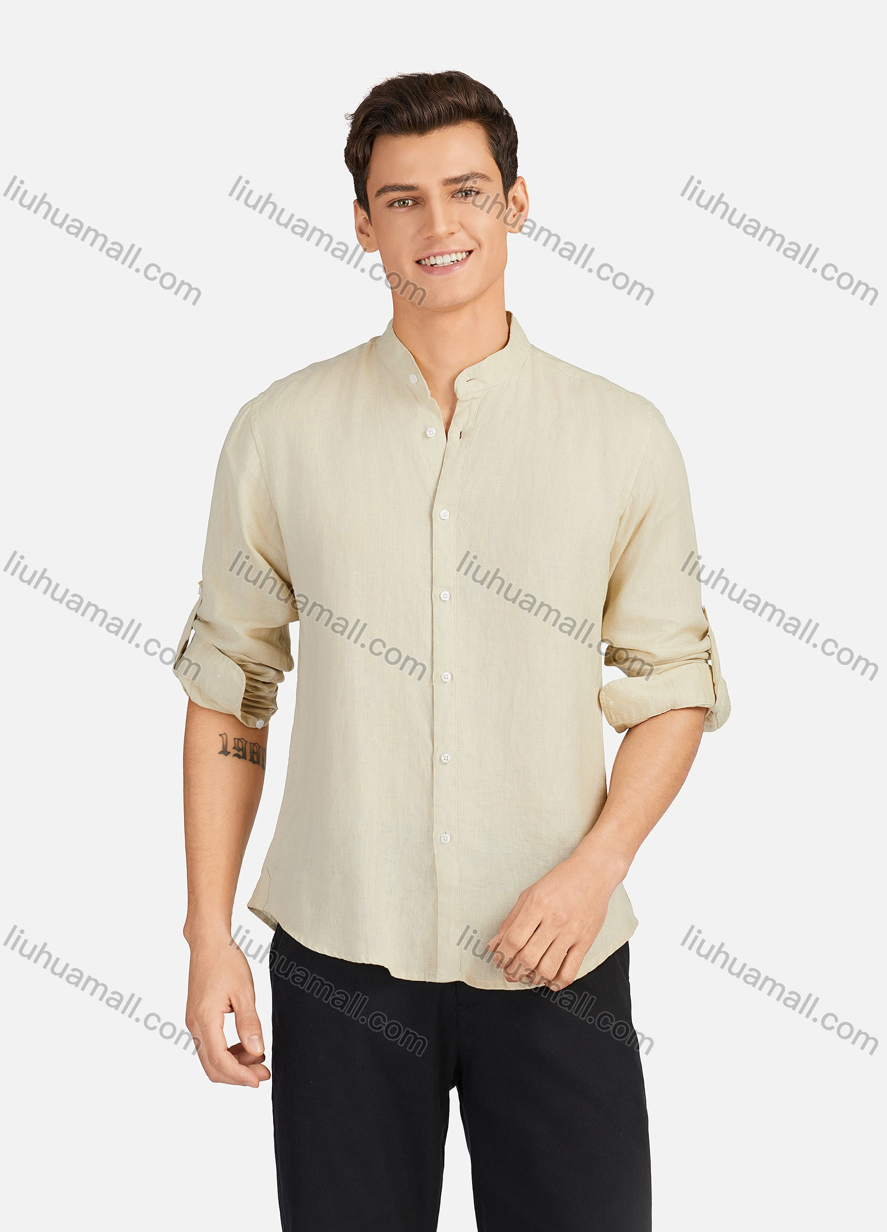 Wholesale Men's Casual Plain Button Down Buckle Strap Cuff Mock Neck Long Sleeve Shirts 874#