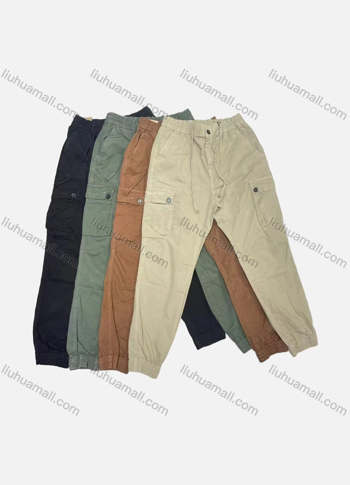 Wholesale Men's Casual Plain Multiple Pockets Drawstring Elastic Waist Cargo Pants W9106#