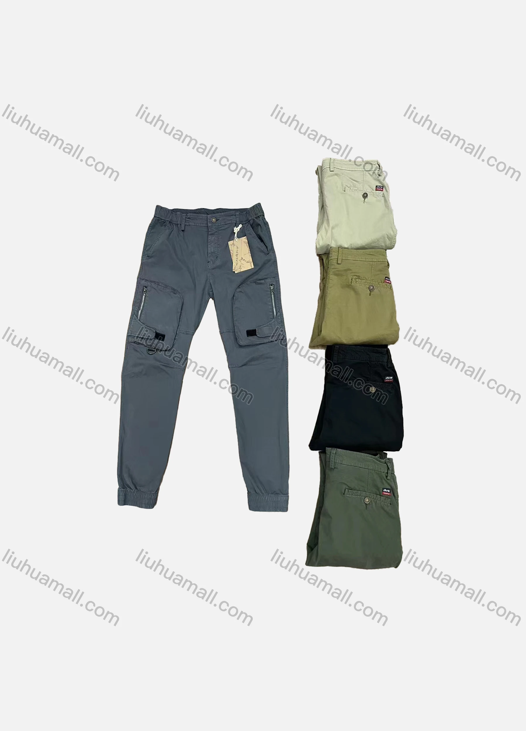 Wholesale Men's Casual Plain Multiple Zipper Pockets Elastic Waist Cargo Pants 9319#
