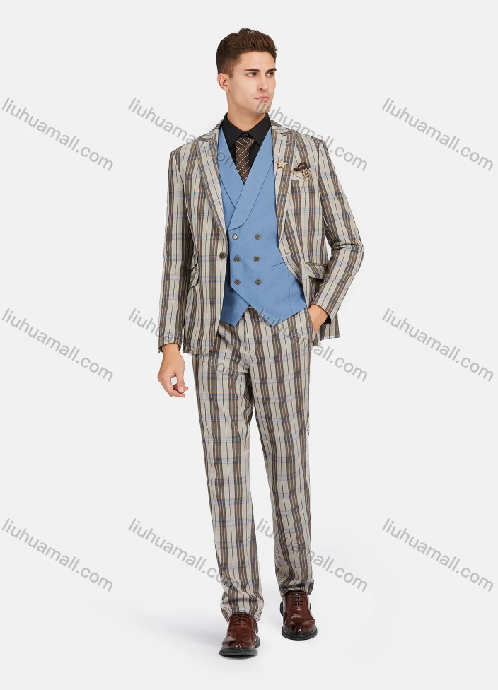 Wholesale Men's Formal Lapel Plaid Pockets Blazer & Waistcoat & Pant 3 Pieces Suit Sets - Liuhuamall