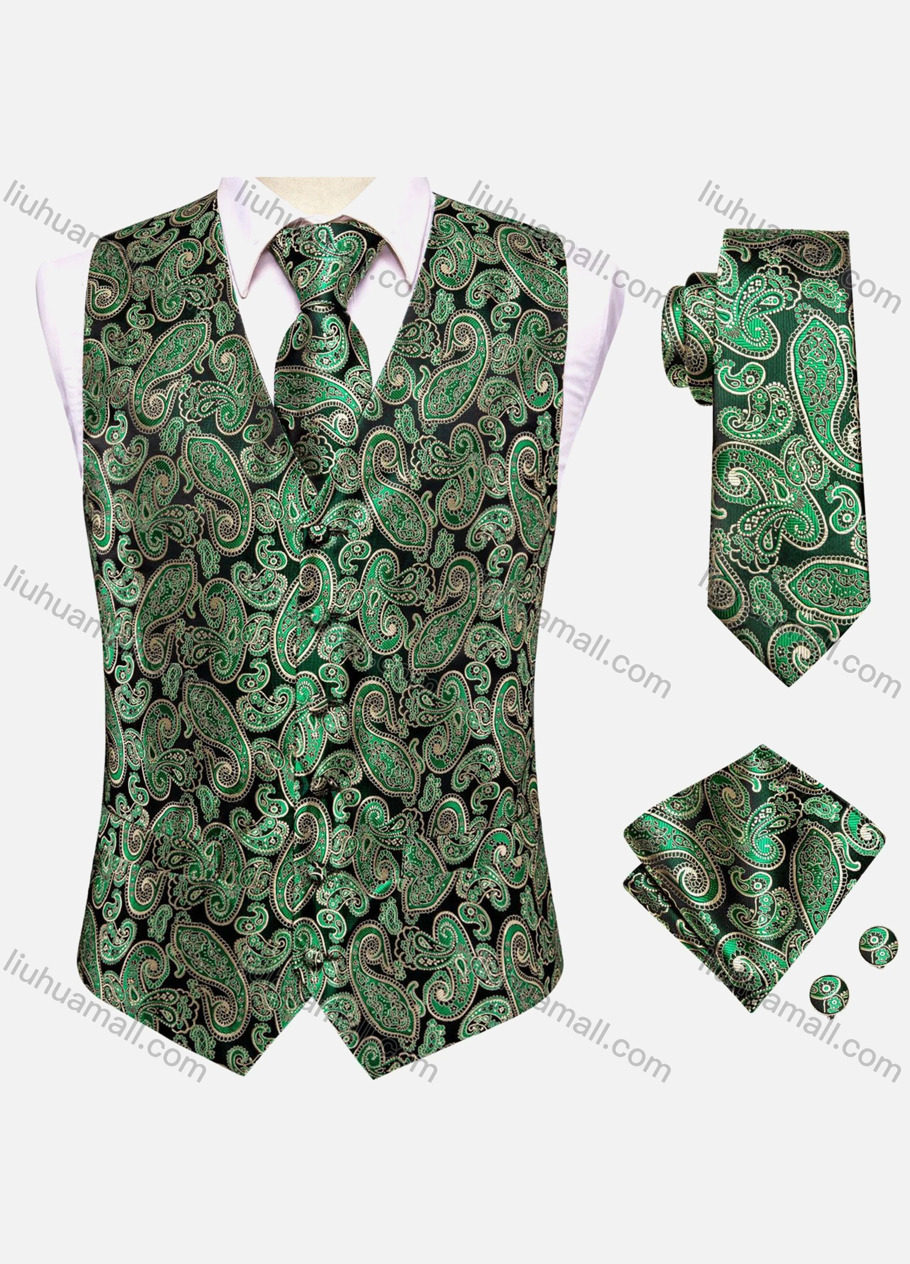 Wholesale Men's Formal Paisley Print Silky Waistcoat With Necktie & Kerchief & Cufflinks 4-piece Set