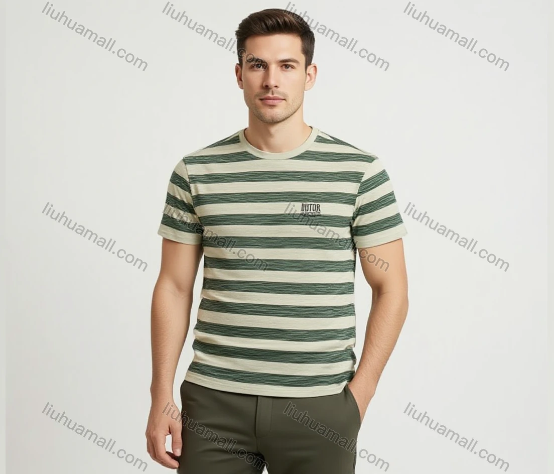 Wholesale Men's Green White Striped T-Shirt Wholesale - NYTOR Chest Logo, Soft Cotton, Crew Neck, Bulk Discounts