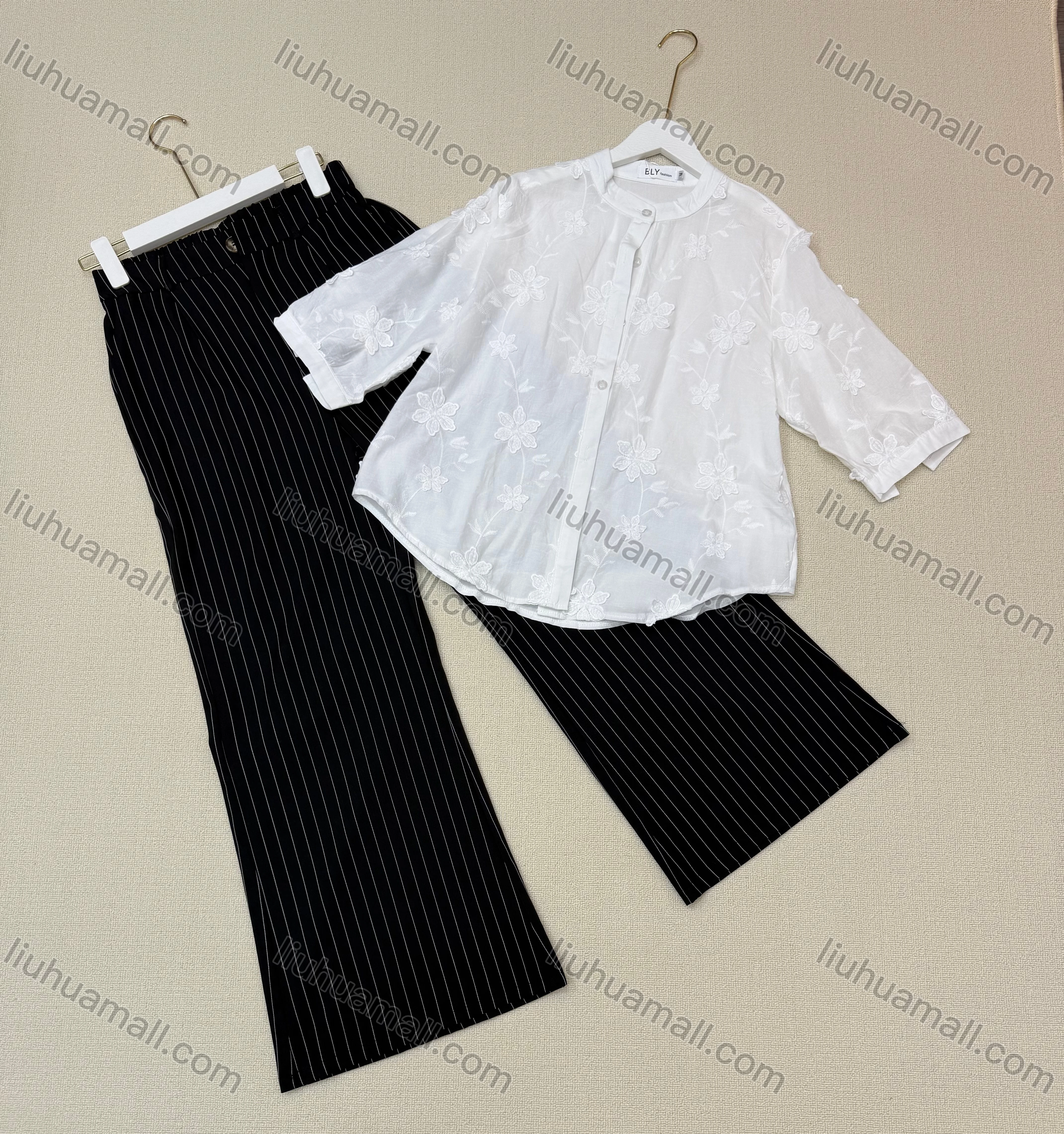 Wholesale Two-piece set: solid color shirt with 3D floral design + striped trousers.