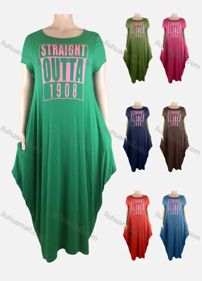 Wholesale Women's African Crew Neck Letter Short Sleeve Pockets Loose Fit Maxi Dress 8804#