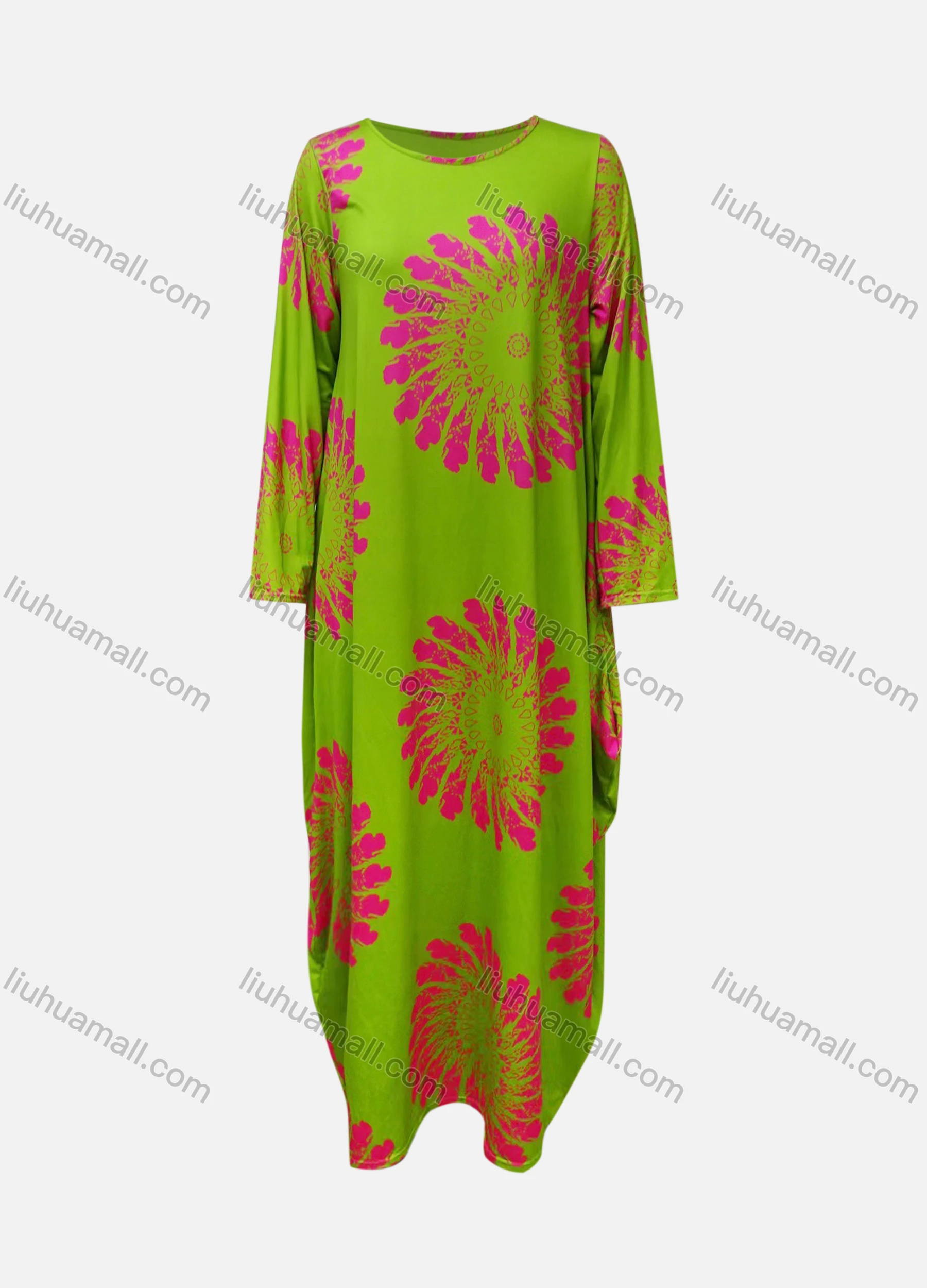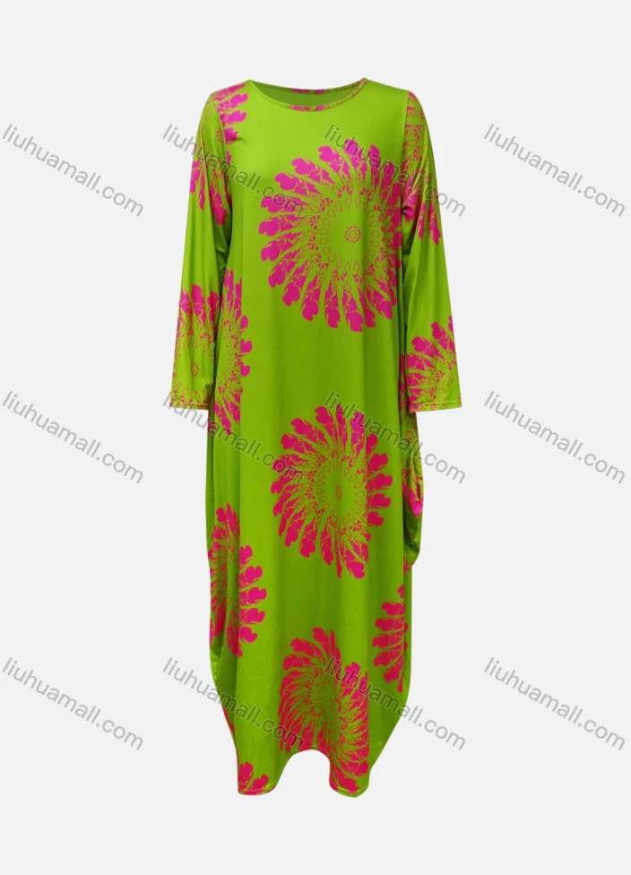 Wholesale Women's African Crew Neck Long Sleeve Floral Curved Hem Loose Fit Dress 8824#