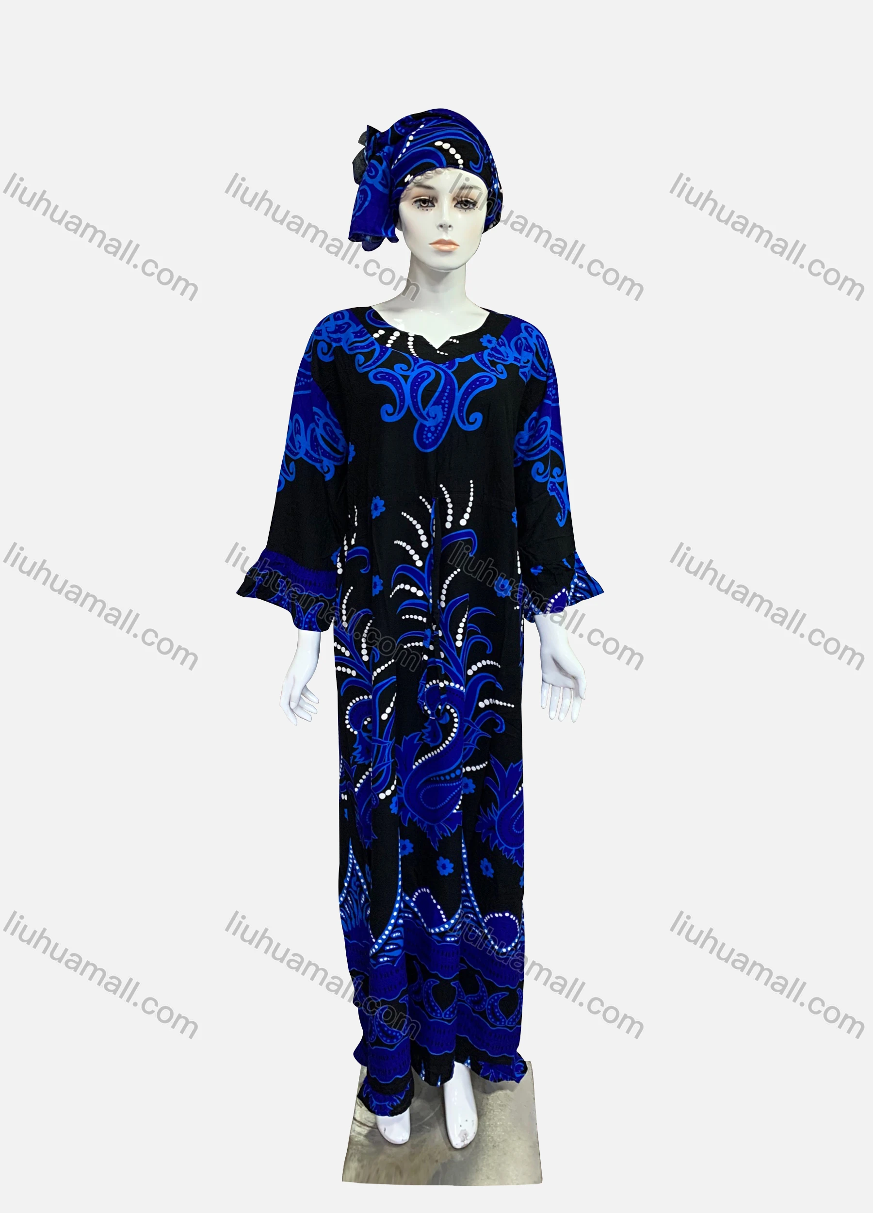 Wholesale Women's African Long Sleeve Paisley Print Notched Maxi Kaftan Dress With Hijab ZXV-748#