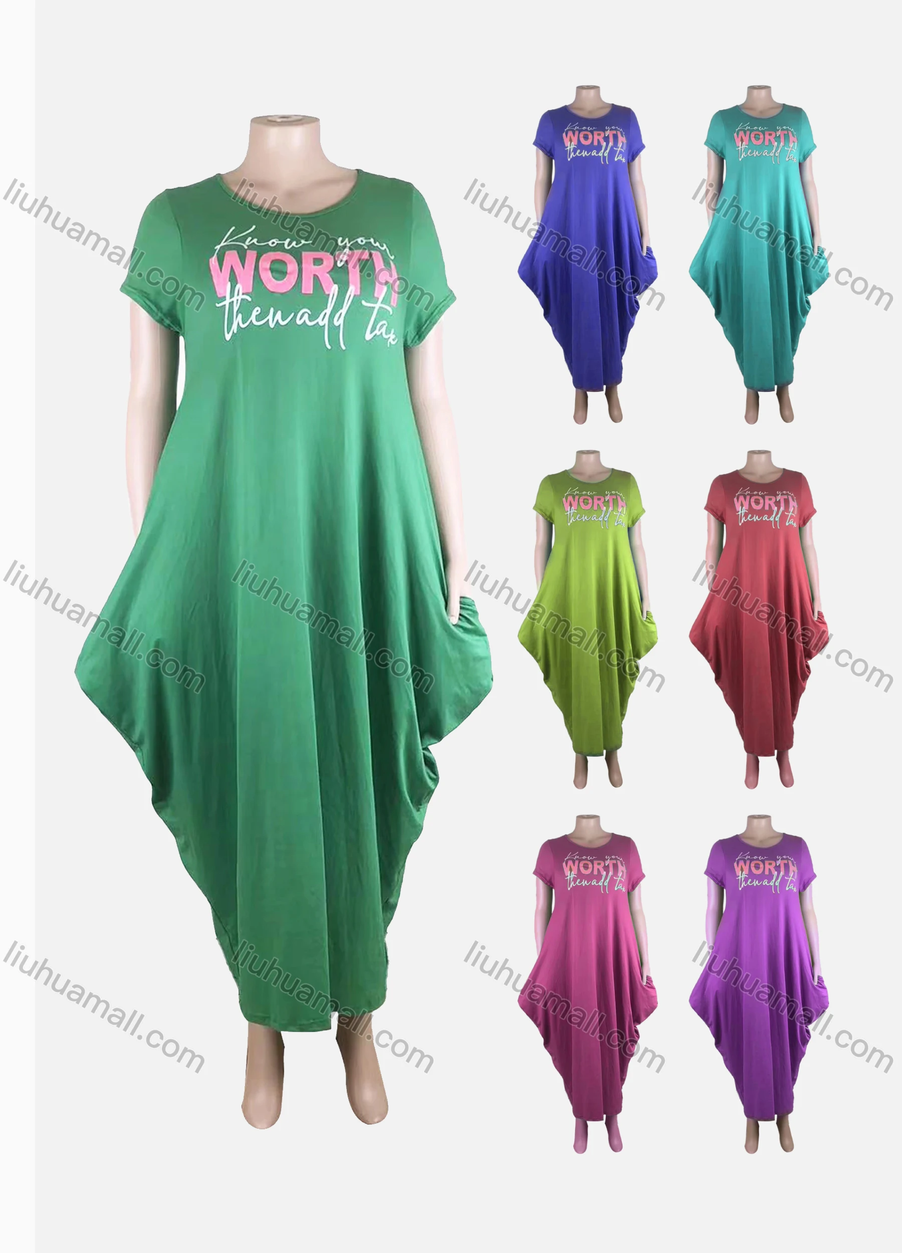 Wholesale Women's African Plus Size Crew Neck Letter Short Sleeve Patch Pocket Loose Fit Dress 8814#