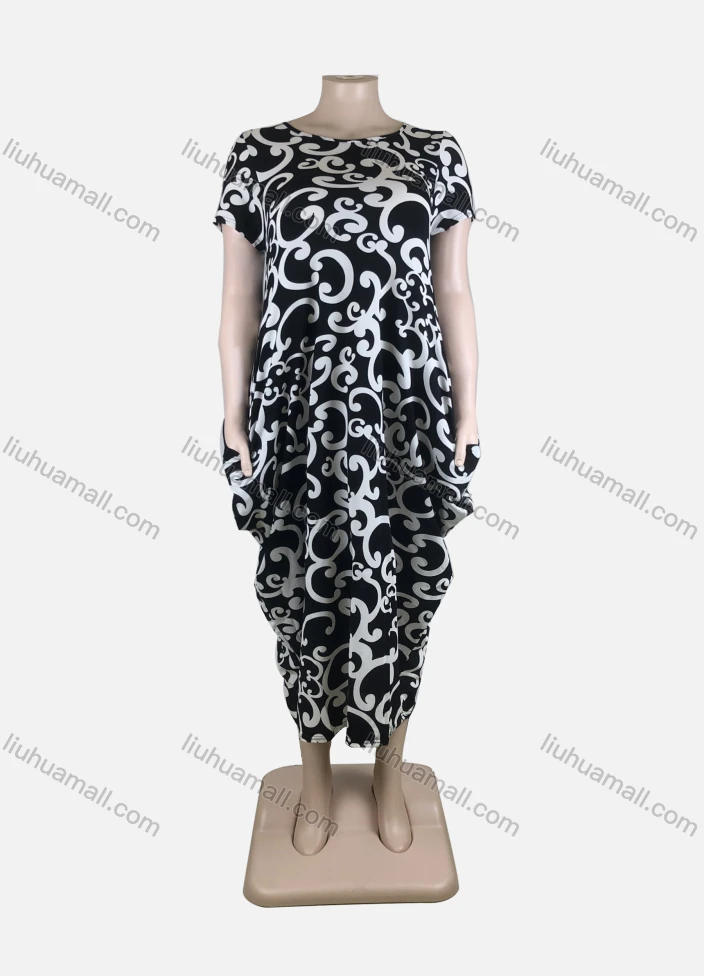 Wholesale Women's African Plus Size Crew Neck Short Sleeve Pockets Loose Fit Dress 8816#