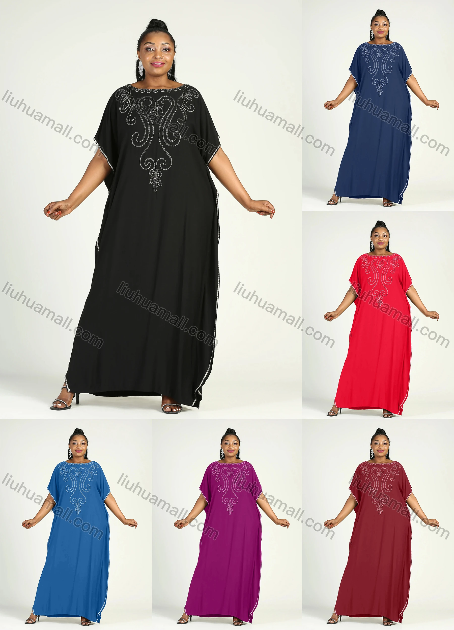 Wholesale Women's African Plus Size Vintage Round Neck Robe Batwing Sleeve Floral Embroidery Plain Kaftan Dress