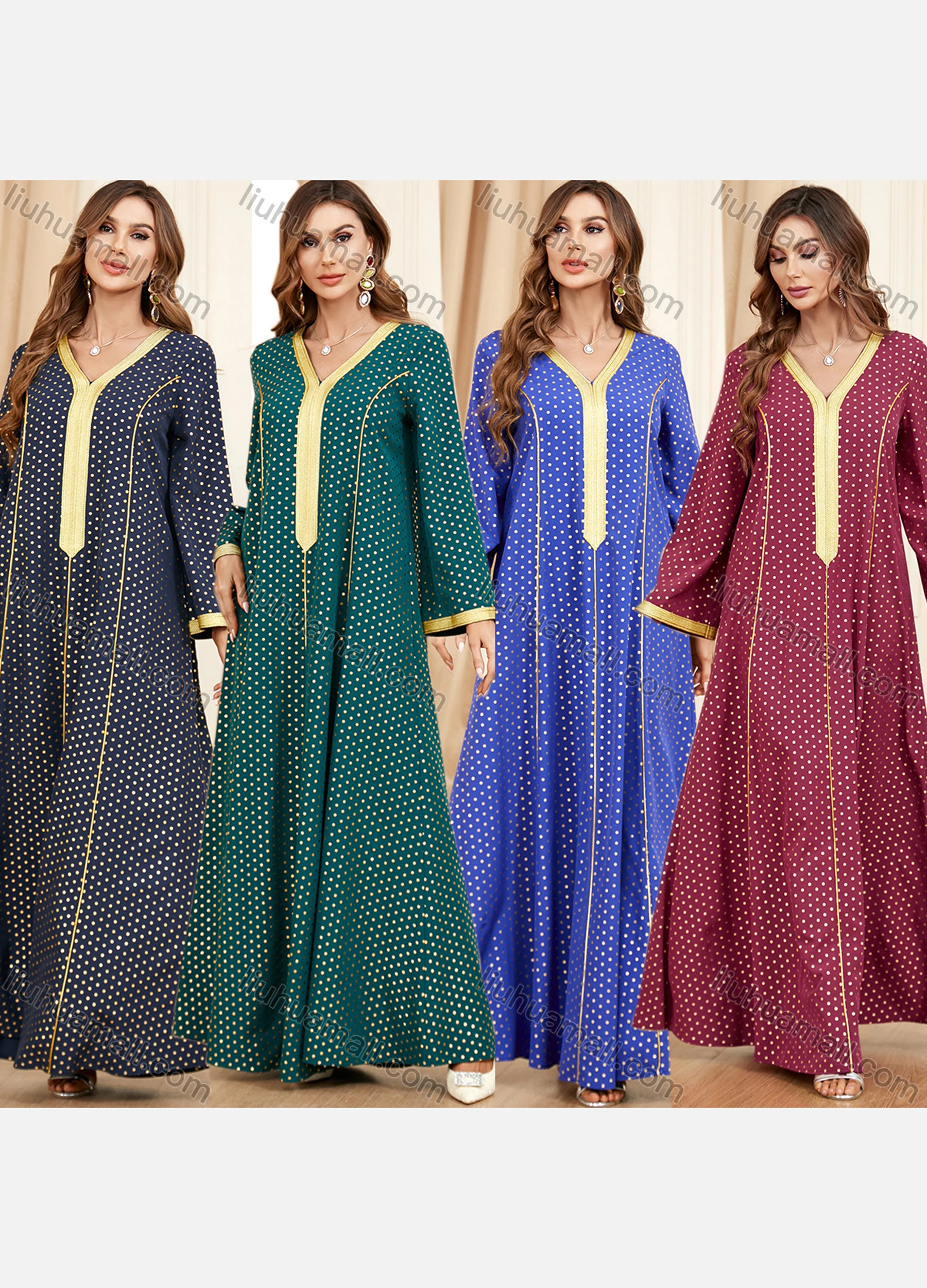 Wholesale Women's Arabic Muslim Islamic V Neck Splicing Dubai Embroidery Abaya Maxi Dress 3396#