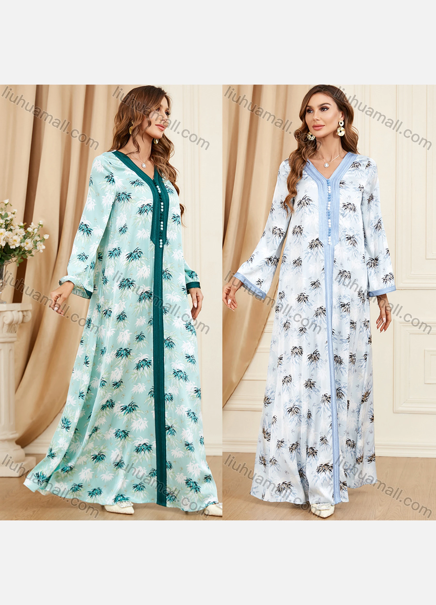 Wholesale Women's Arabic Muslim Islamic V Neck Splicing Dubai Embroidery Abaya Maxi Dress 3400#