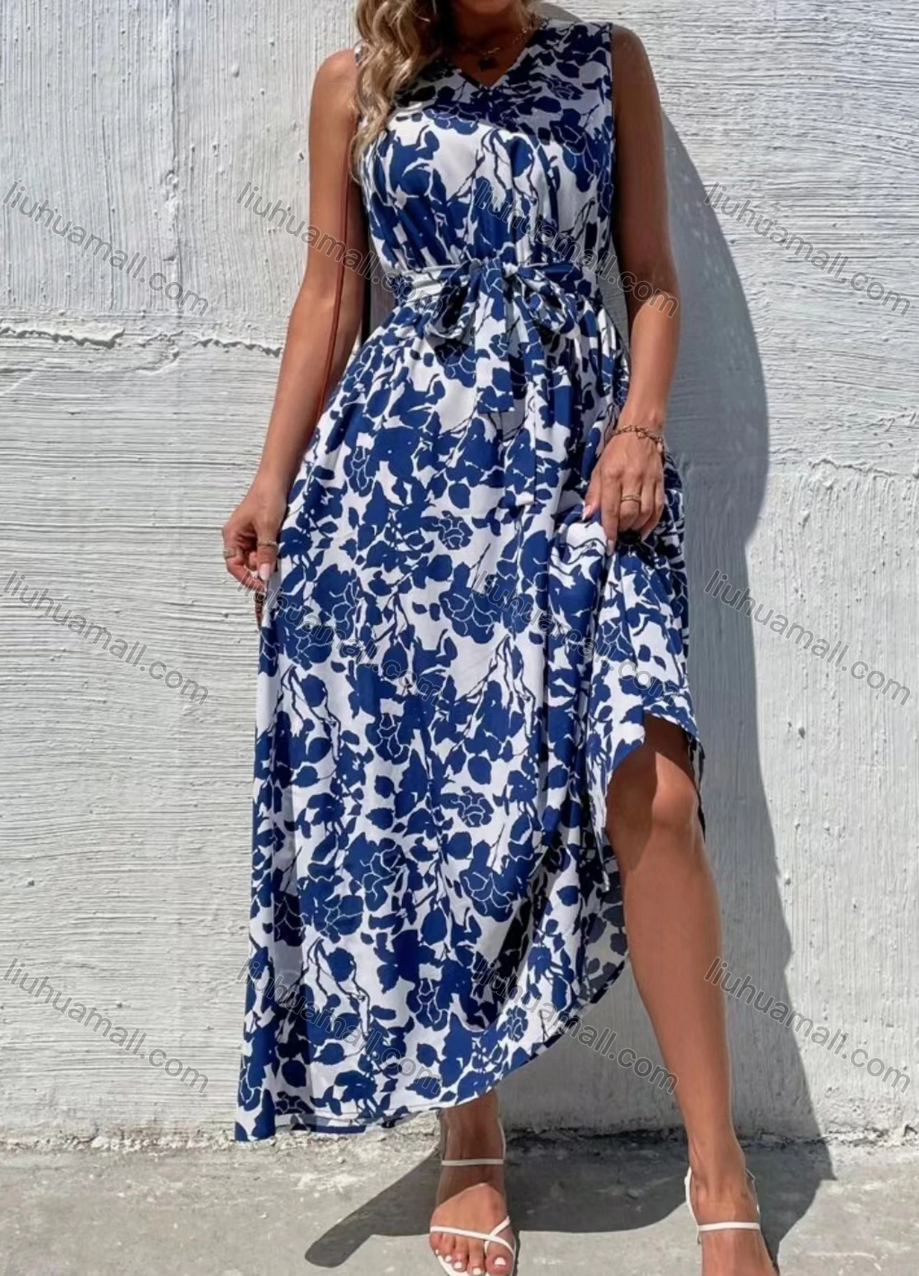 Wholesale Women's Casual Allover Print V Neck Maxi Tank Dress With Belt