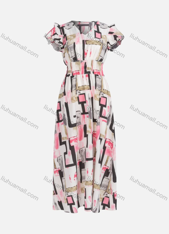 Wholesale Women's Casual Allover Print V Neck Short Sleeve Shirred Ruffle Trim Maxi Dress Y20037#