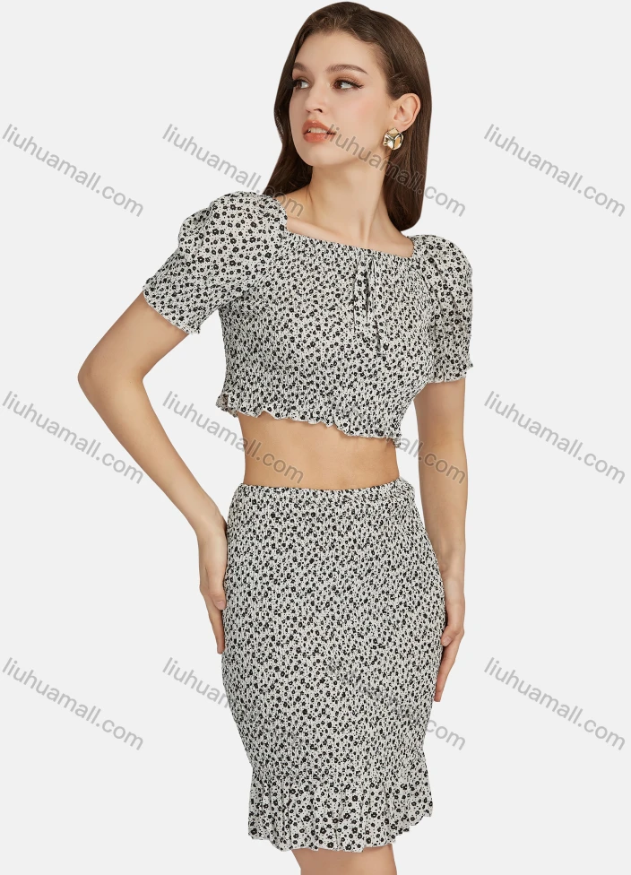 Wholesale Women's Casual Bateau Neck Tie Front Short Sleeve Floral Crop Top 2-piece Set 28296#