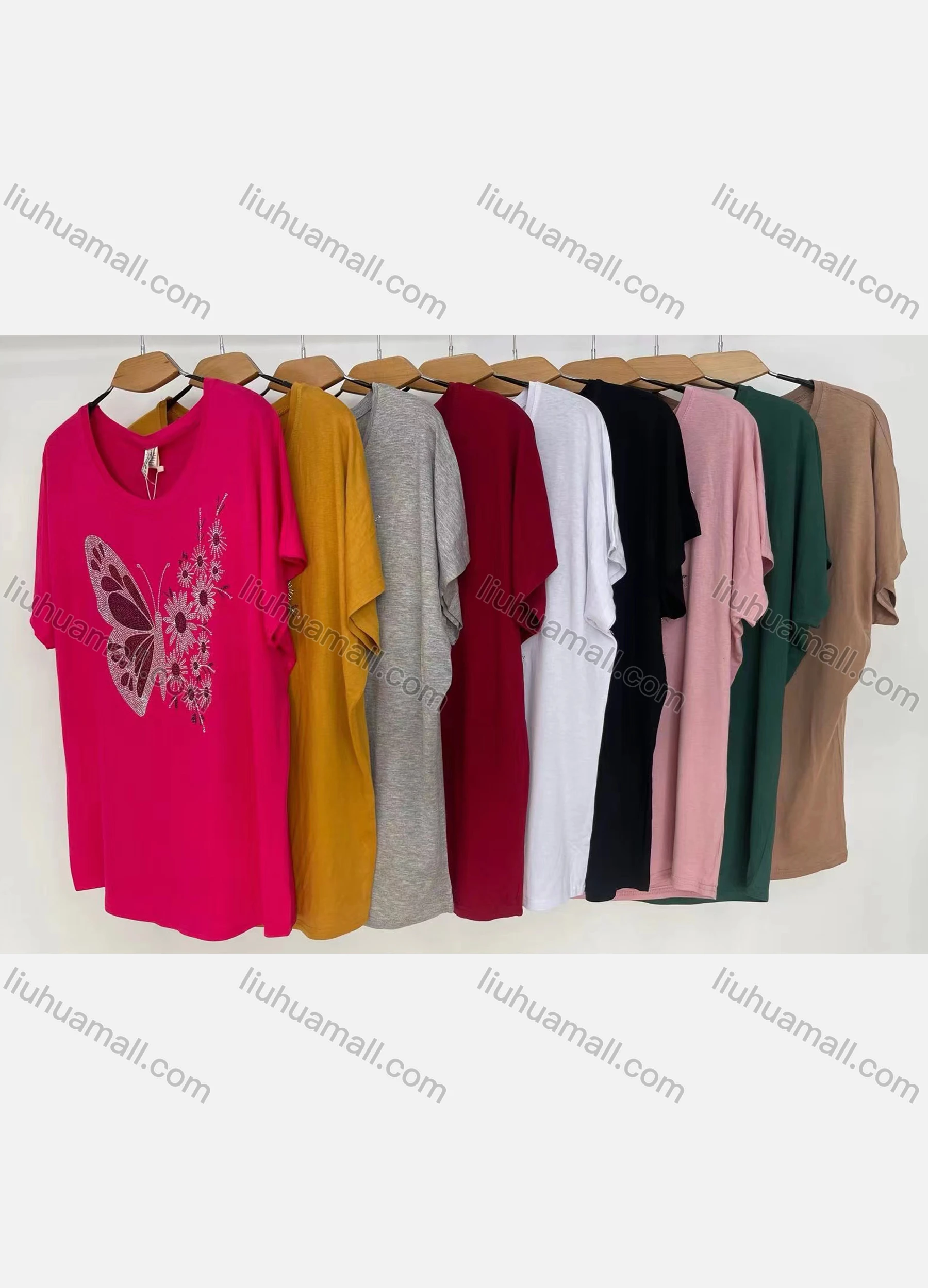 Wholesale Women's Casual Butterfly Print Rhinestone Crew Neck Short Sleeve Blouse
