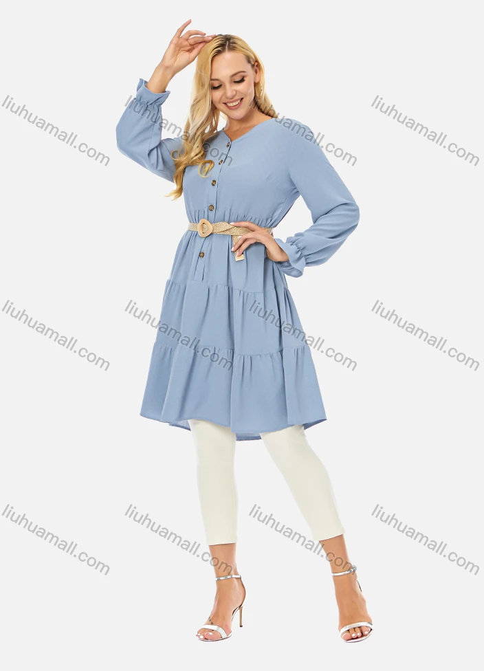 Wholesale Women's Casual Button Front Belted V-Neck Poet Sleeve Tiered Plain Dress 070#