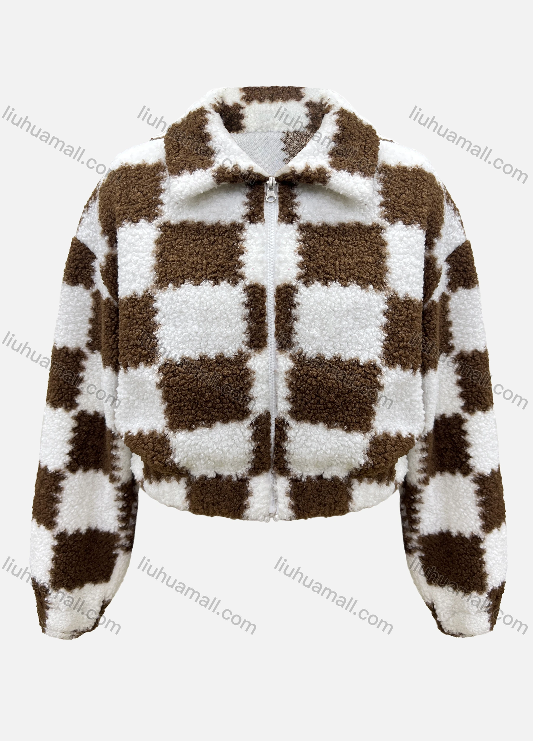 Wholesale Women's Casual Checkerboard Print Zipper Long Sleeve Crop Fluffy Jacket