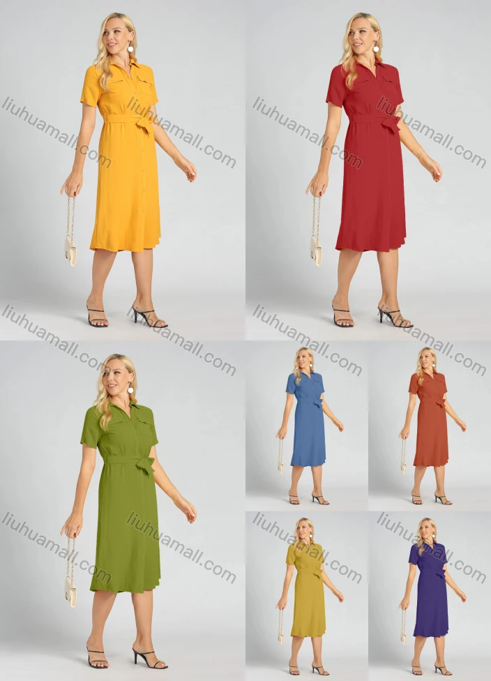 Wholesale Women's Casual Collared Button Front Belted Plain Midi Shirt Dress