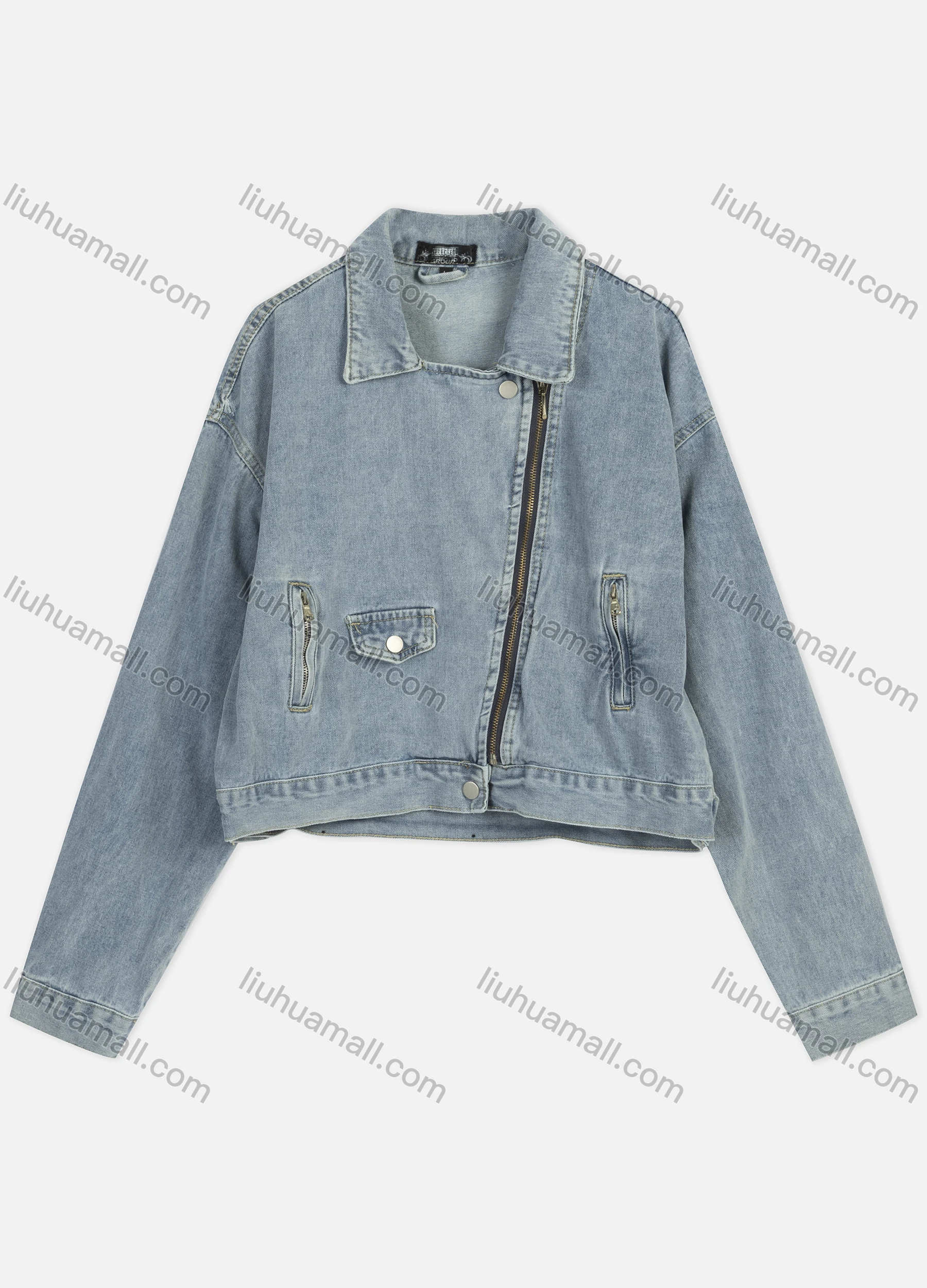 Wholesale Women's Casual Collared Plain Pockets Drop Shoulder Zipper Crop Denim Jacket