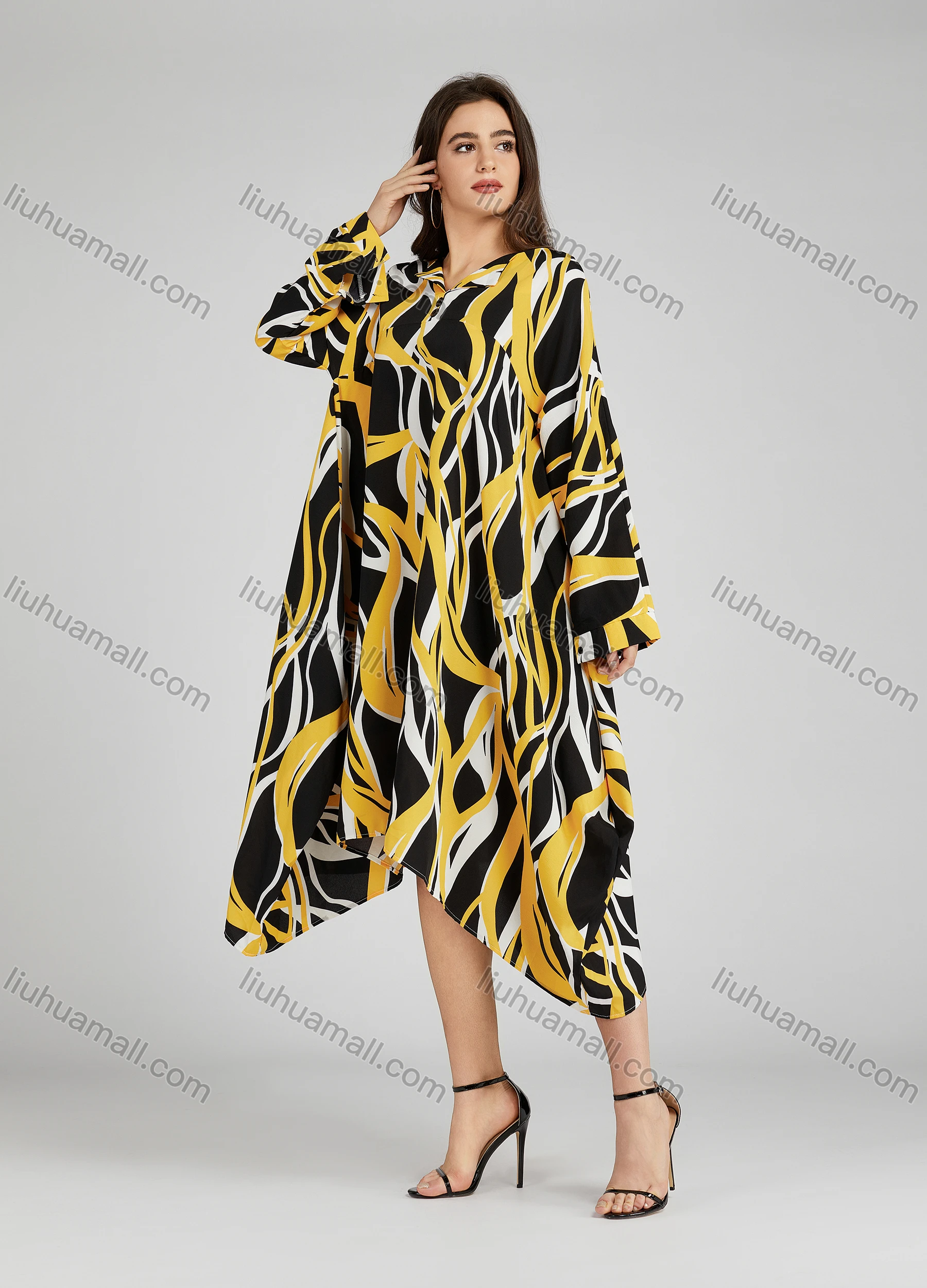 Wholesale Women's Casual Collared Shirt Sleeve High Low Hem Allover Print Loose Fit Maxi Dress 208#
