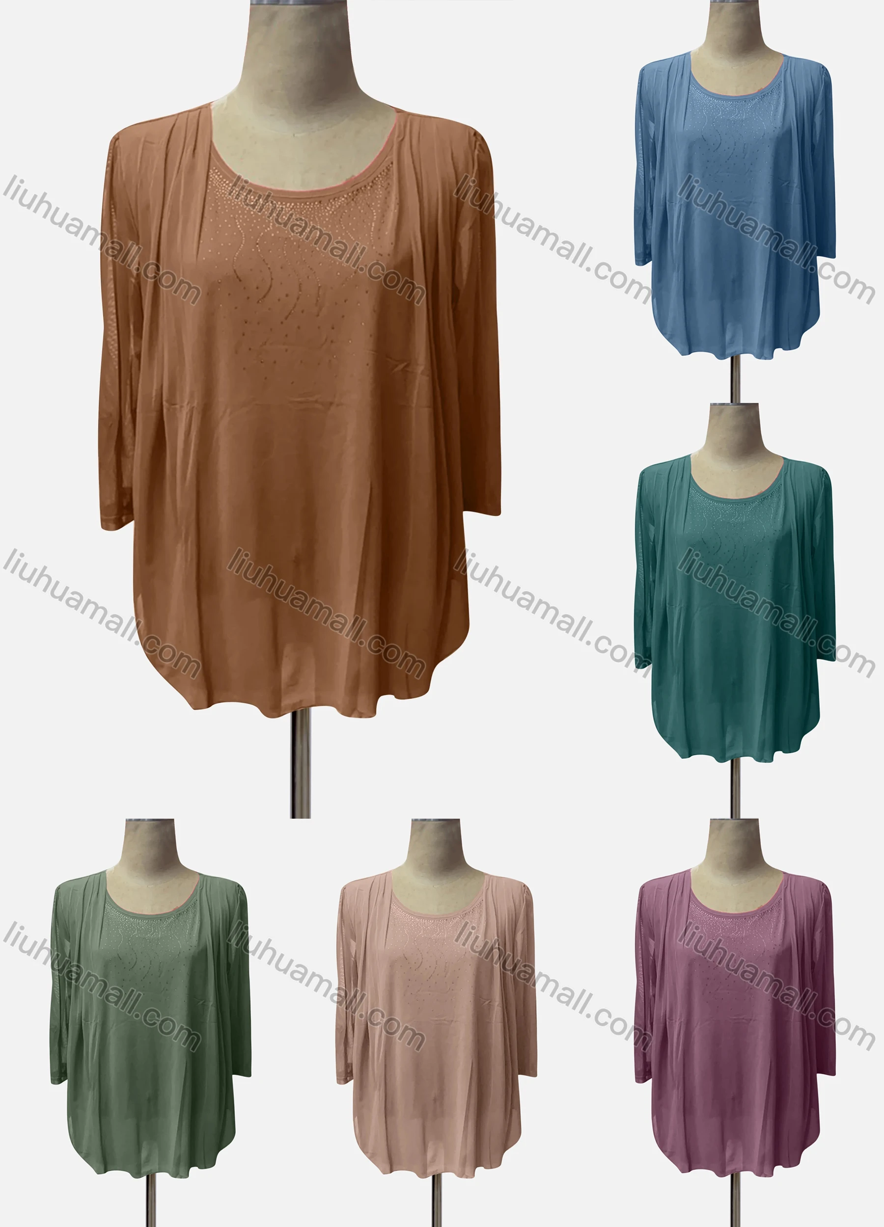 Wholesale Women's Casual Crew Neck 3/4 Sleeve Rhinestone Blouse