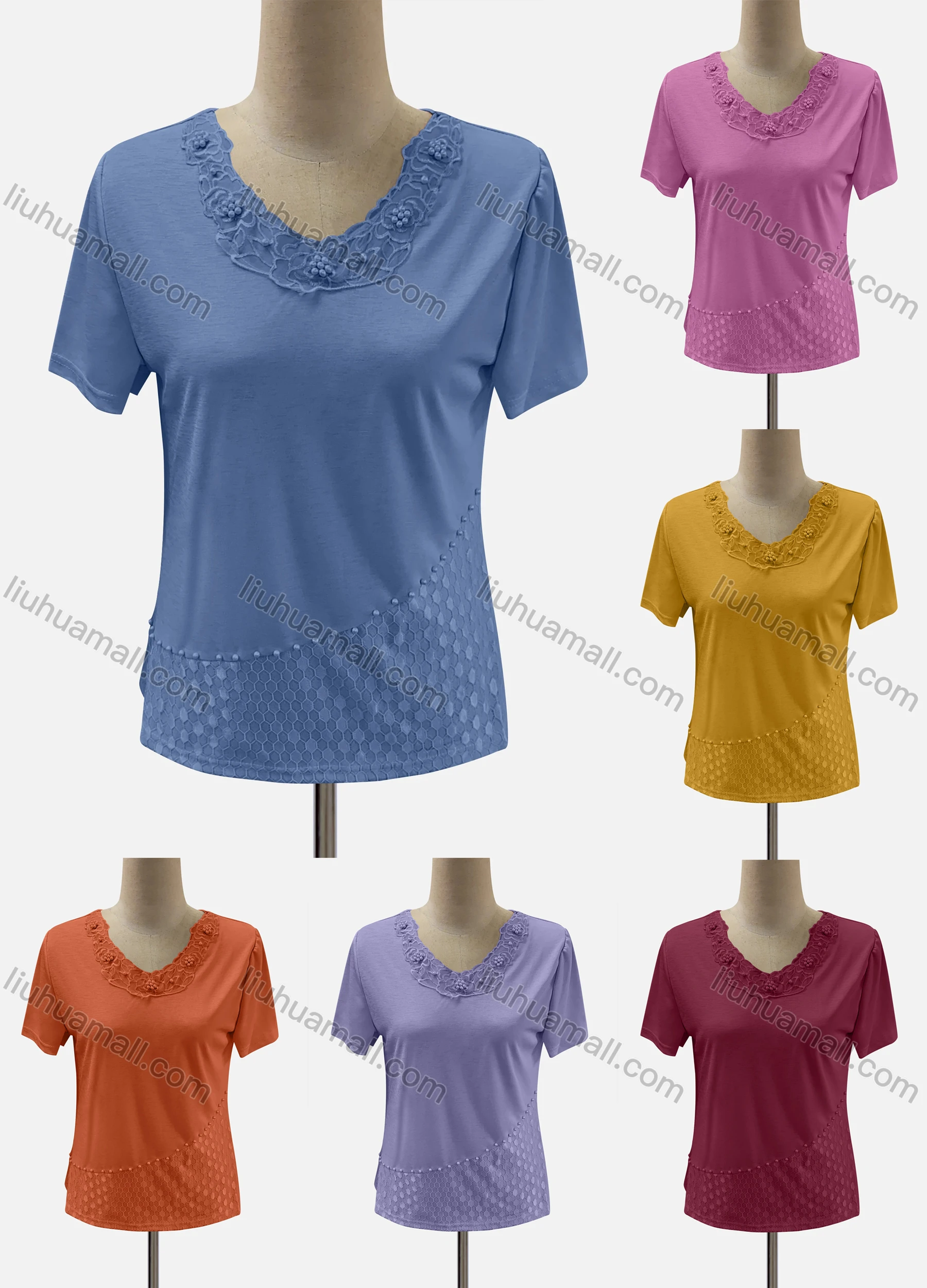 Wholesale Women's Casual Crew Neck Short Sleeve Lace Trim Beaded Blouse