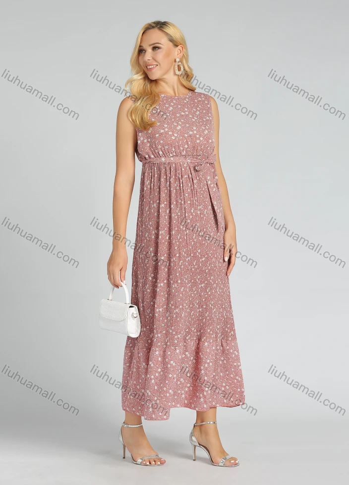 Wholesale Women's Casual Crew Neck Sleeveless Belted Ditsy Floral Maxi Dress