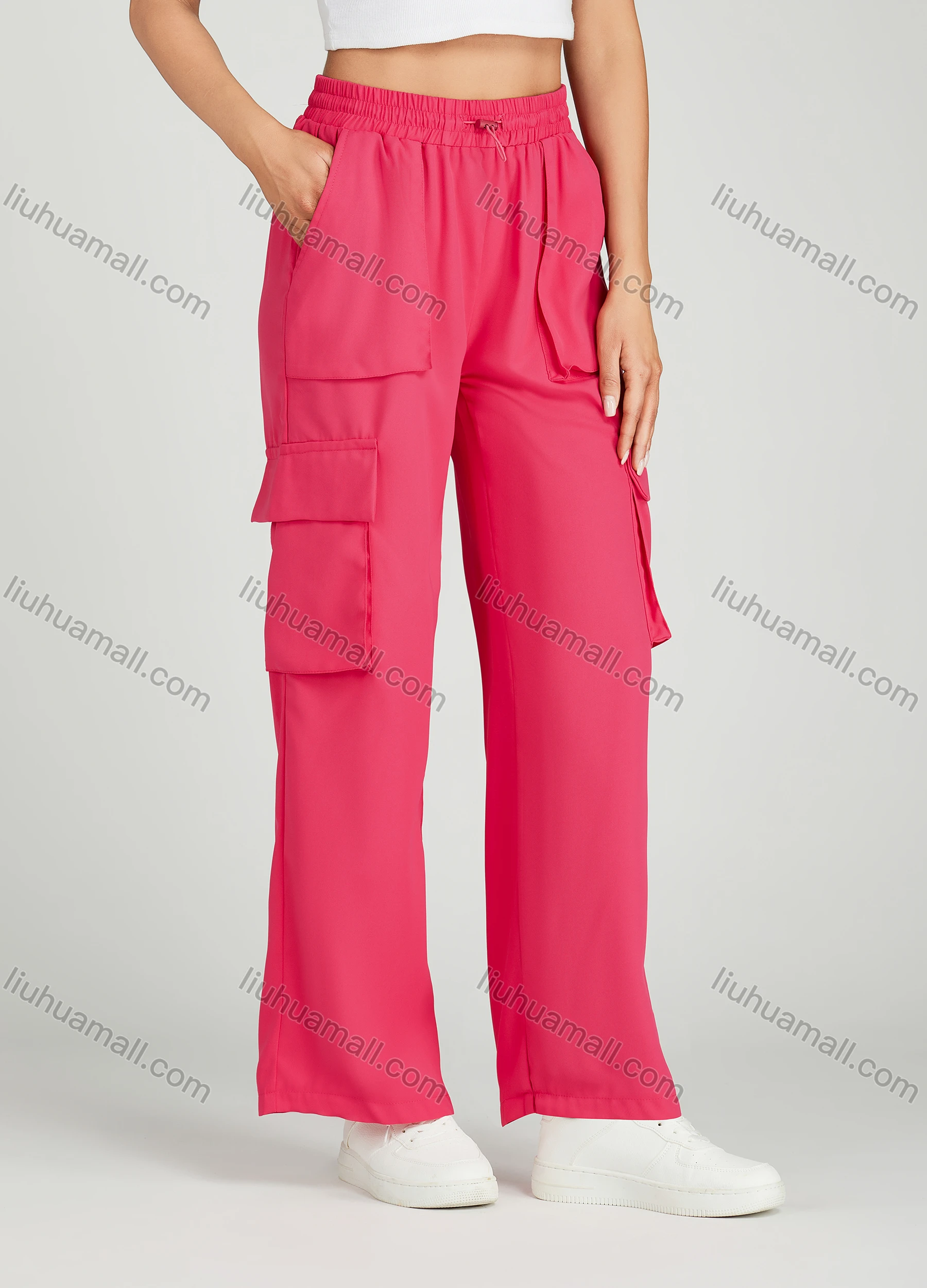 Wholesale Women's Casual Drawstring Elastic Waist Multiple Pockets Plain Cargo Pants MT258#