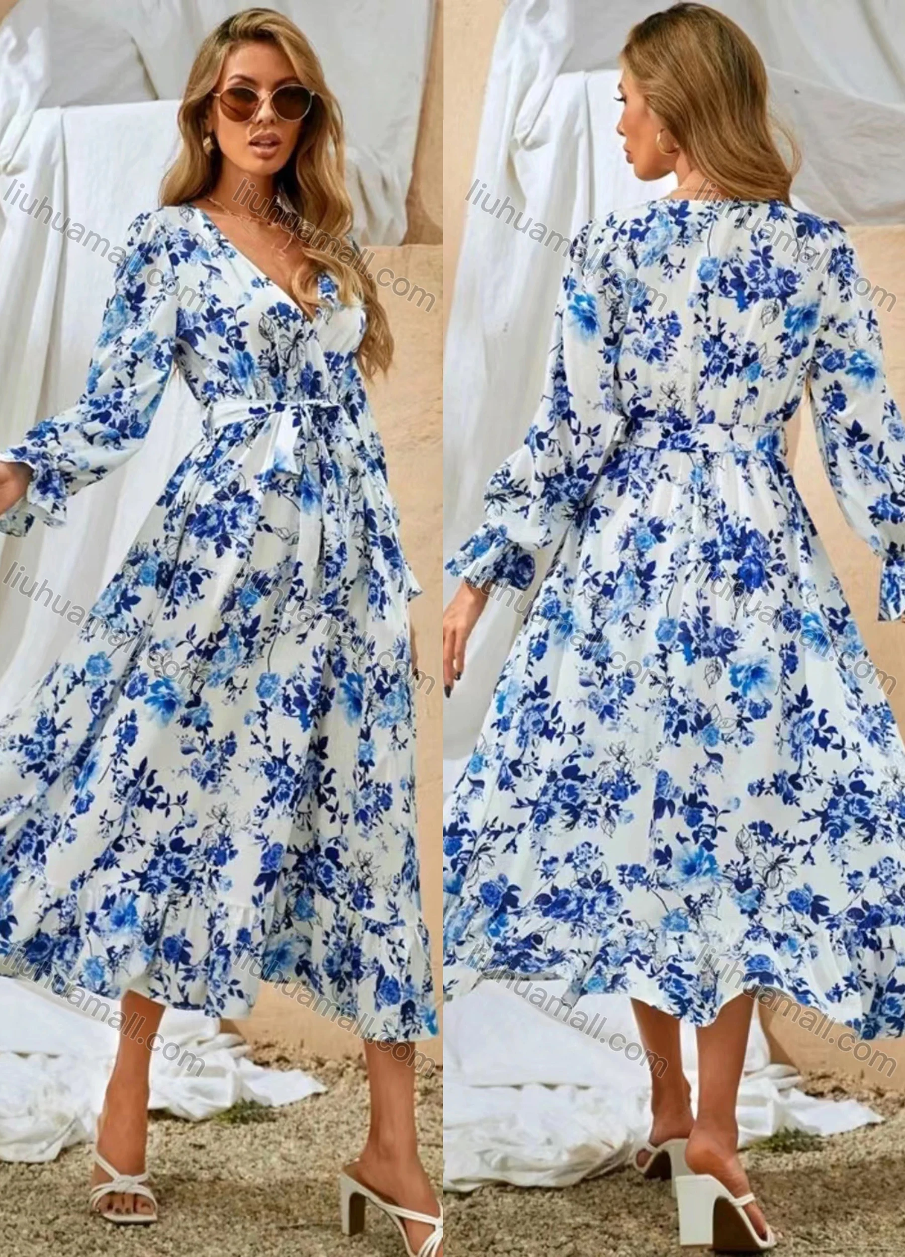 Wholesale Women's Casual & Fashion Floral Print Wrap V Neck Long Sleeve Ruffle Hem Midi Dress With Belt