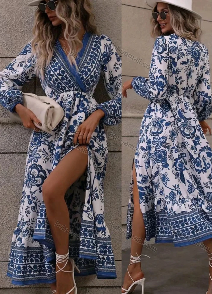 Wholesale Women's Casual & Fashion Wrap V Neck Long Sleeve Split Side Midi Dress