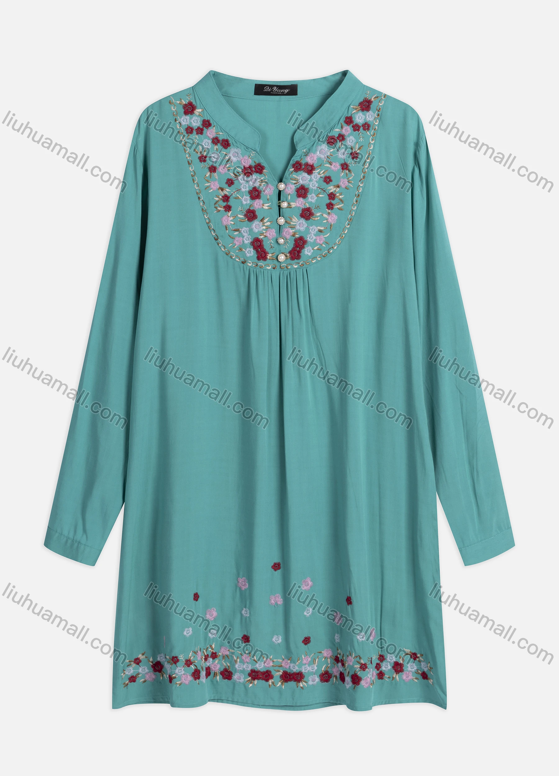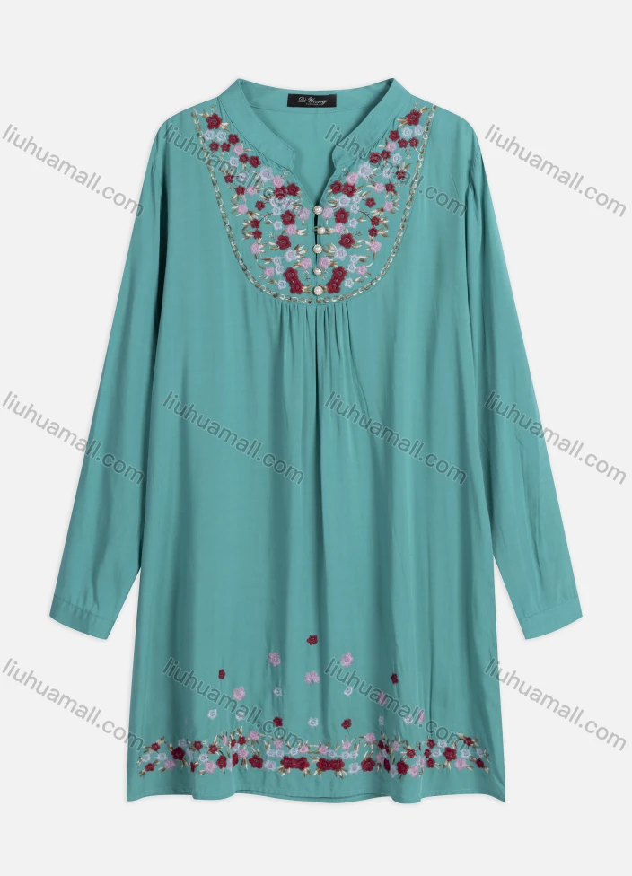Wholesale Women's Casual Floral Embroidered Ruched Pearl Decor Notched Neck Long Sleeve Tunic ZT3023-2