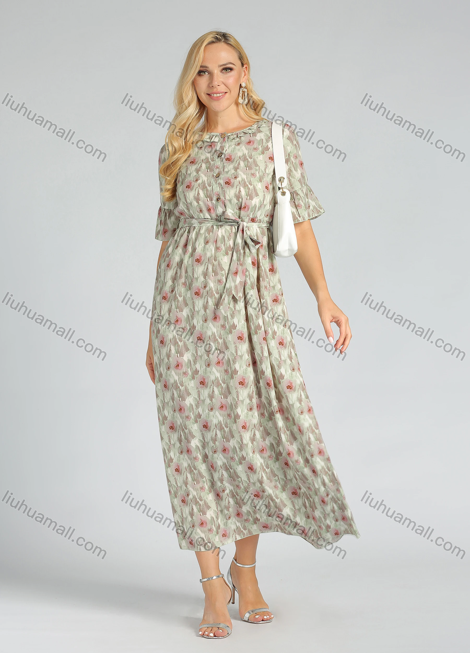 Wholesale Women's Casual Floral Painting Button Belted Maxi Dress