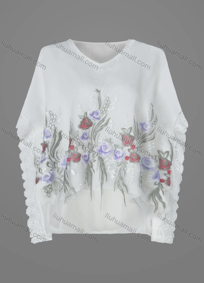 Wholesale Women's Casual Floral Print Embroidered V Neck Guipure Lace Batwing Sleeve Top