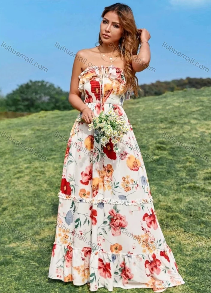 Wholesale Women's Casual Floral Print Strapless Lace Up Shirred Ruffle Trim Maxi Dress