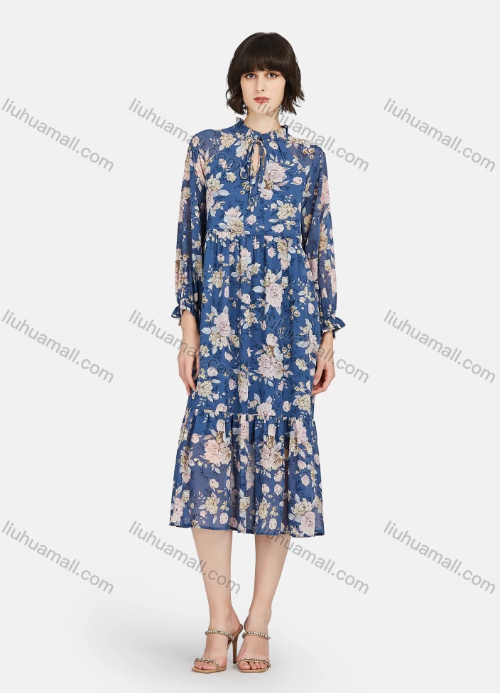 Wholesale Women's Casual Floral Print Tie Neck Poet Sleeve Ruffle Hem Midi Dress