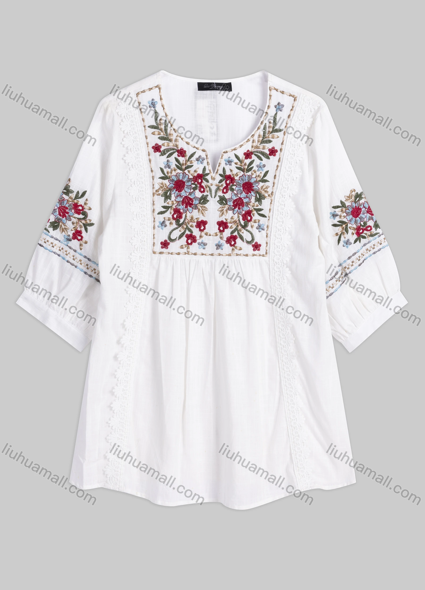 Wholesale Women's Casual Floral Ruched Notched Neck Lace Trim Half Sleeve Blouse A127#
