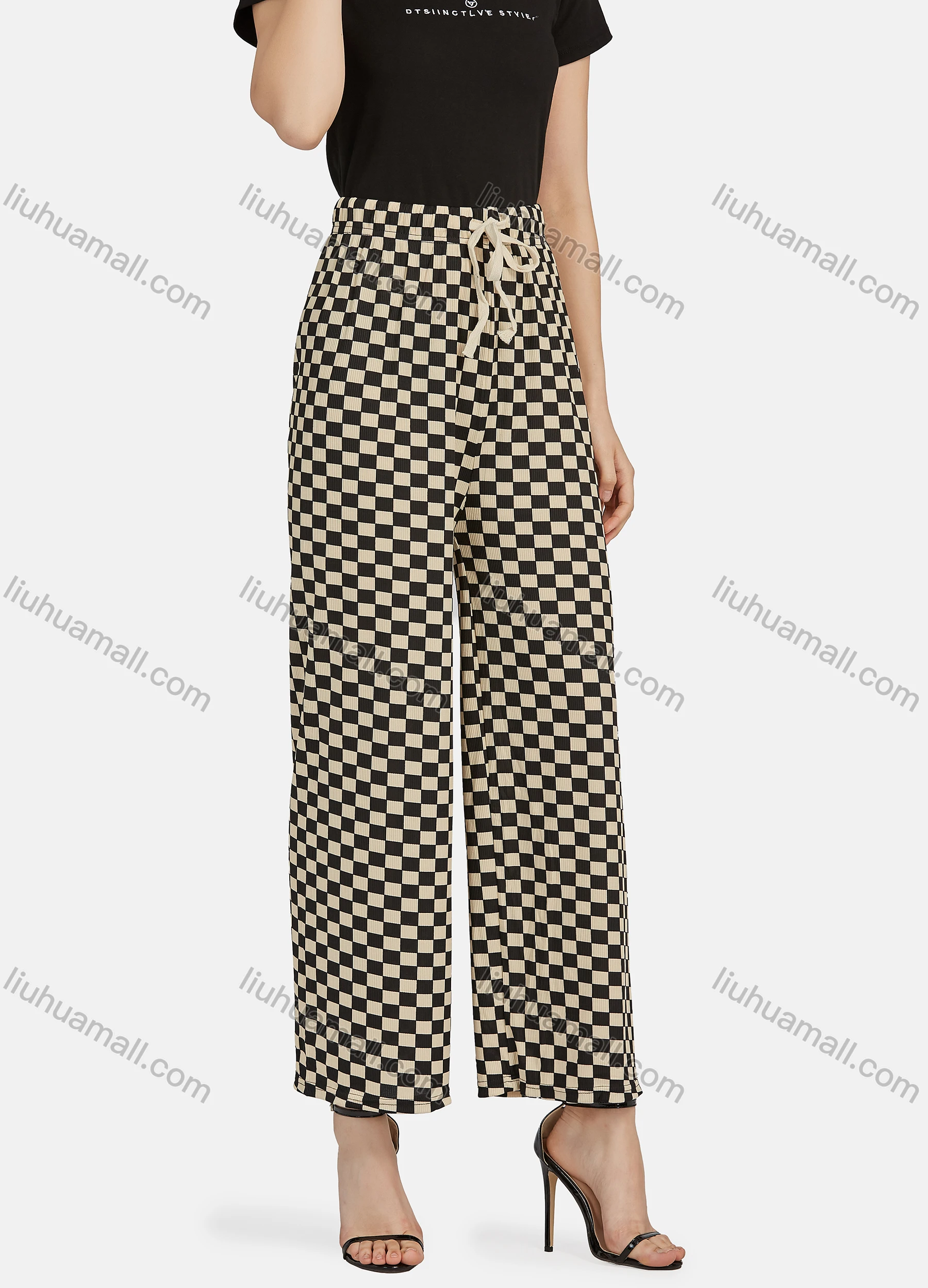 Wholesale Women's Casual High Waist Drawstring Checkerboard Wide Leg Pants 2201#