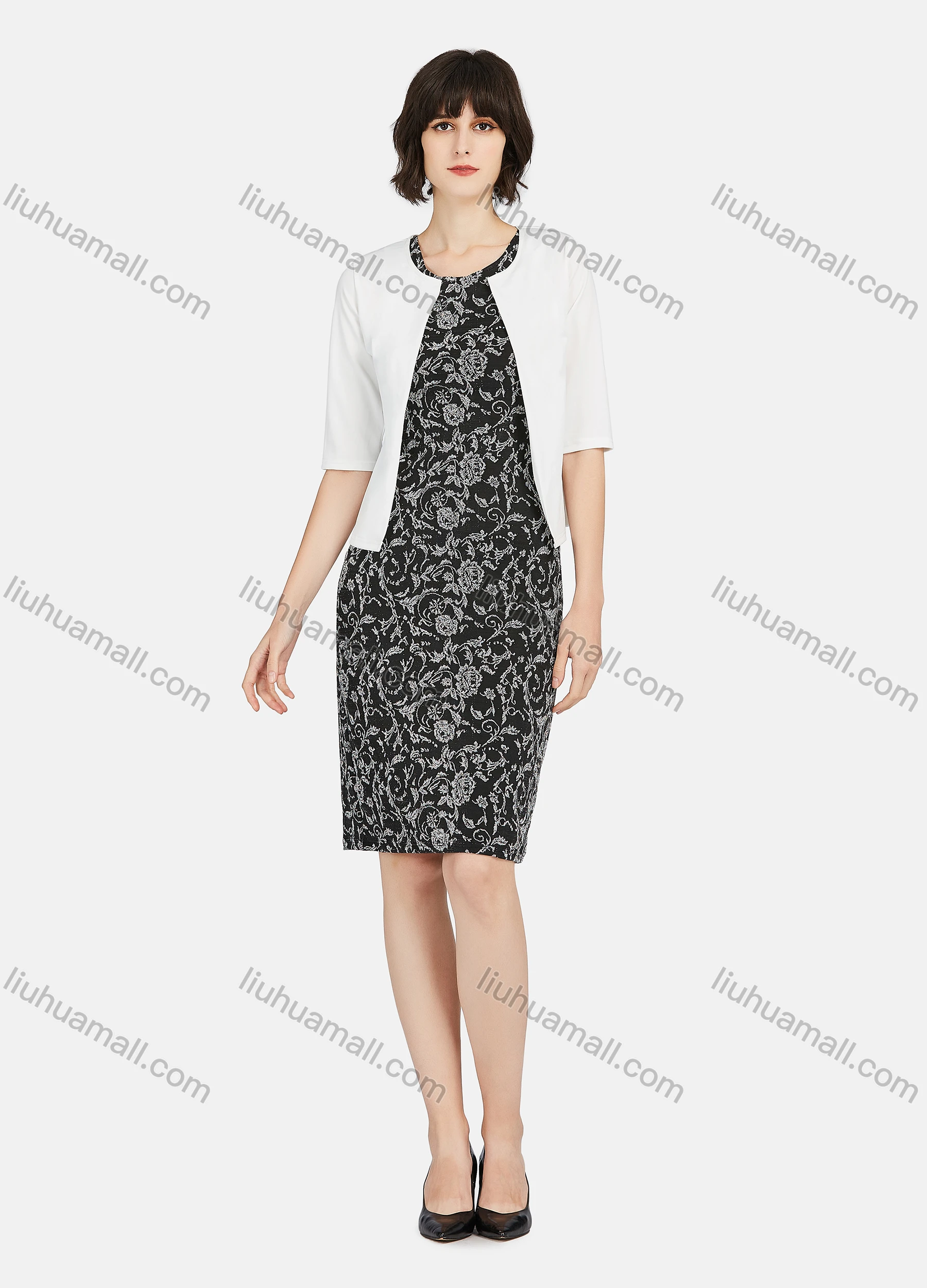 Wholesale Women's Casual Lace Sleeve Jacquard Dress & Plain Cardigan Set