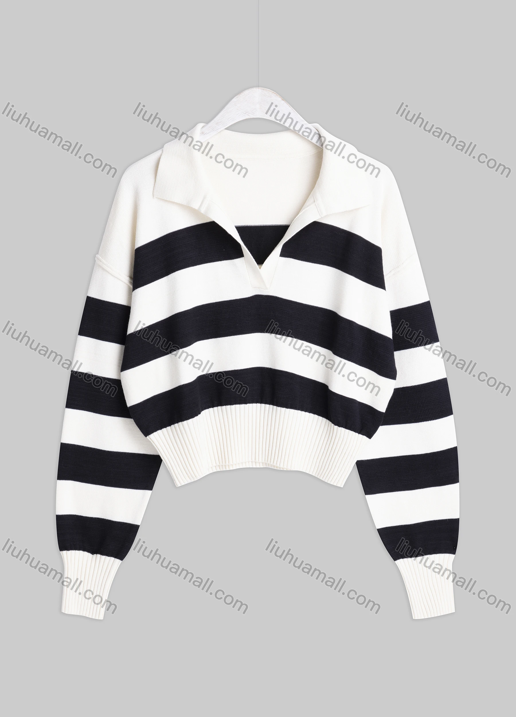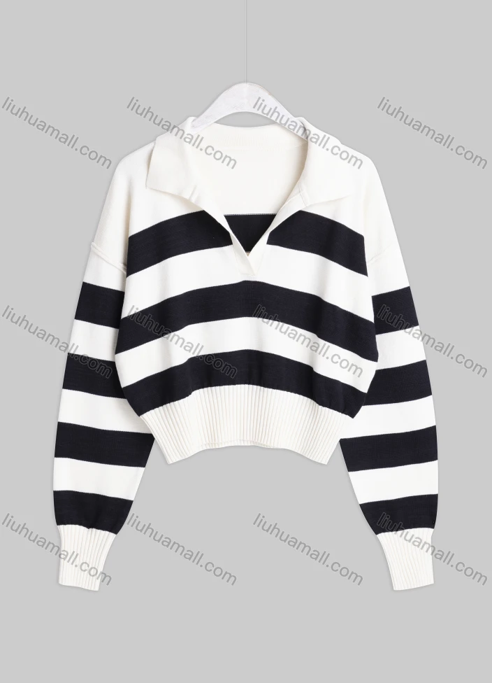 Wholesale Women's Casual Lapel Drop Shoulder Long Sleeve Striped Knit Sweater SMS7417#