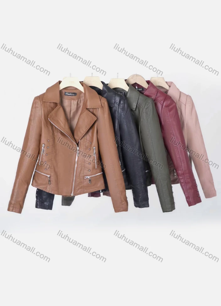 Wholesale Women's Casual Lapel Long Sleeve Zipper Plain Leather Crop Biker Jacket - Liuhuamall