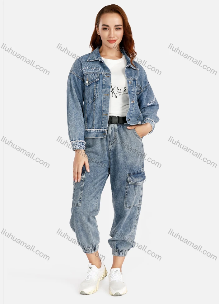 Wholesale Women's Casual Long Sleeve Button Front Letter Flap Pockets Denim Jacket & Wide Leg Jeans Set