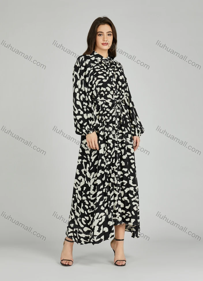 Wholesale Women's Casual Mock Neck Bishop Sleeve Allover Print Lace Up Shirt Dress 202#