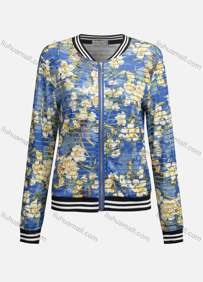 Wholesale Women's Casual Mock Neck Long Sleeve Zip Floral Print Striped Jacket 6467#