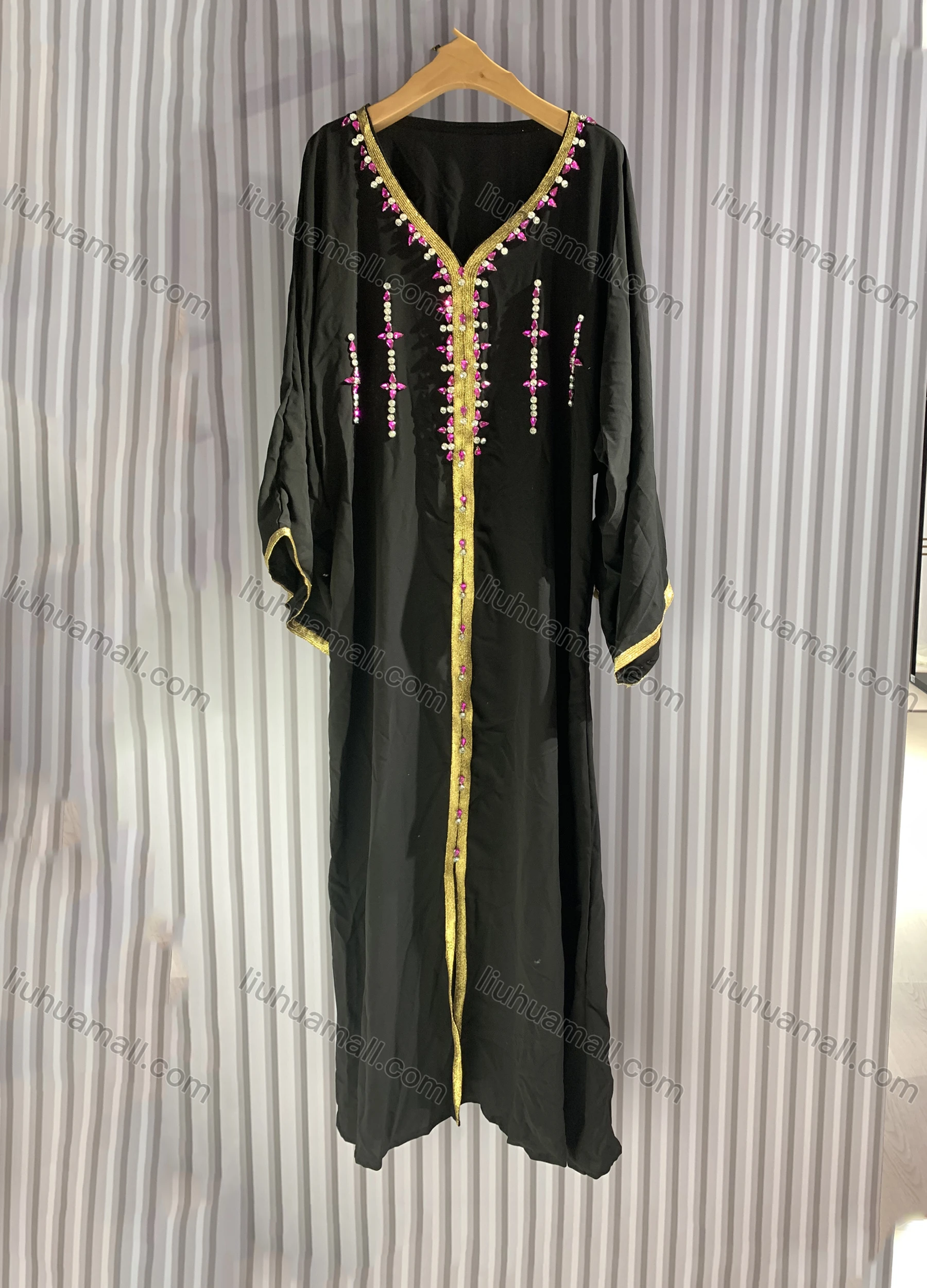 Wholesale Women's Casual Muslim Islamic V Neck Plain Rhinestone Decor Maxi Abaya Dress