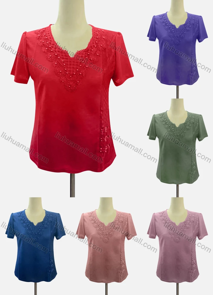 Wholesale Women's Casual Notched Neck Short Sleeve Beaded Appliques Blouse