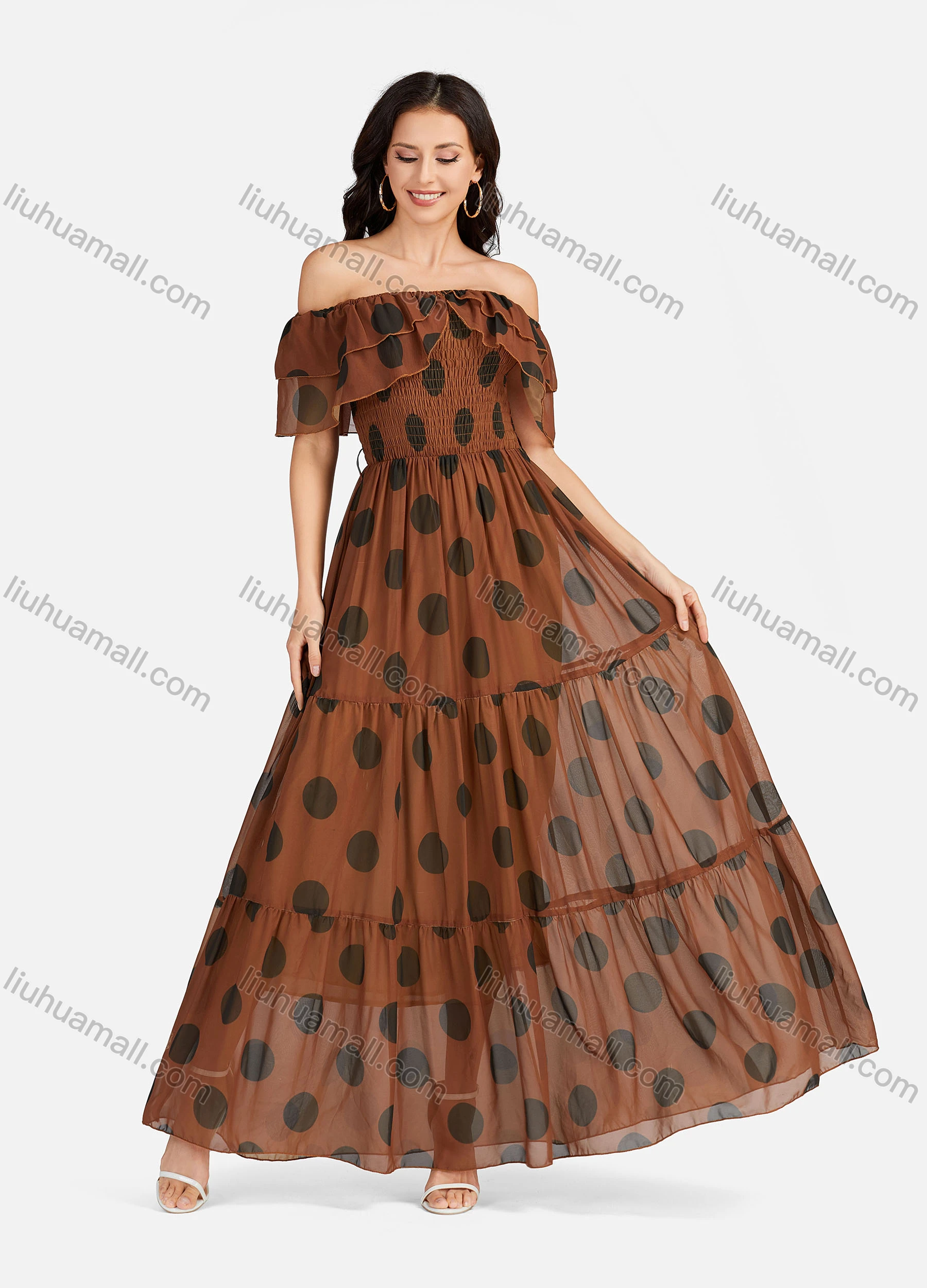 Wholesale Women's Casual Off Shoulder Ruffle Trim Polka Dot Tiered Hem Maxi Dress B632#