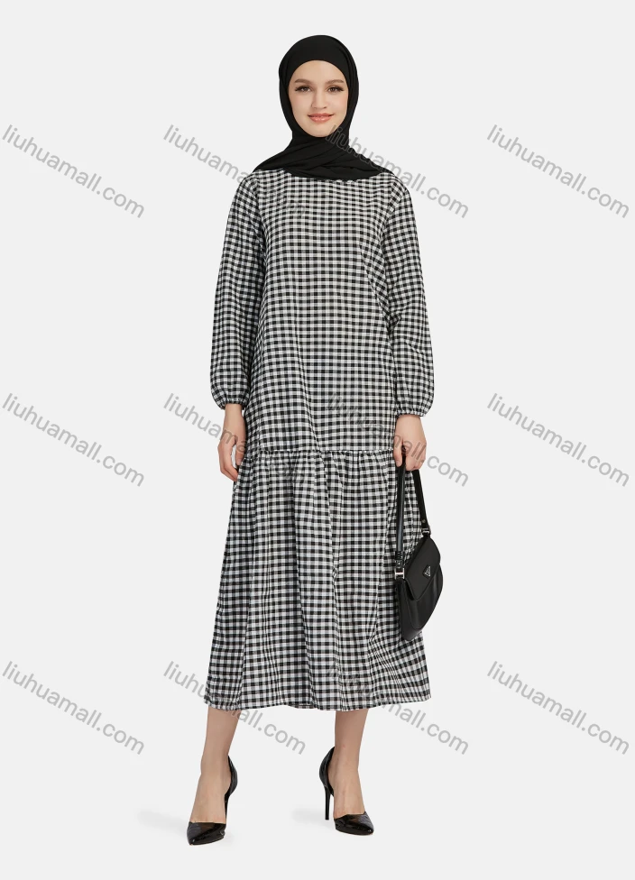 Wholesale Women's Casual Plaid Print Long Sleeve Ruffle Hem Midi Dress 1309#