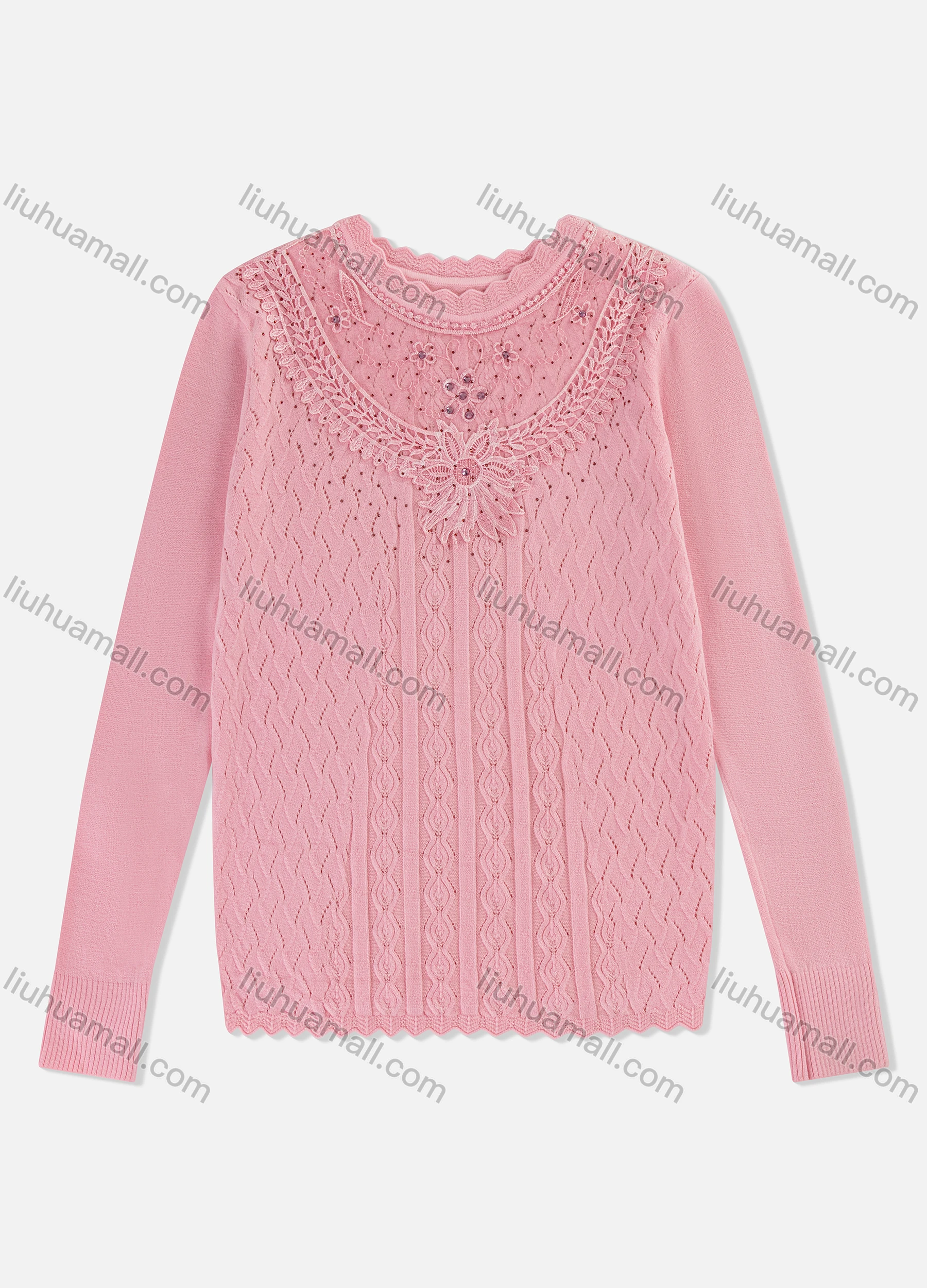 Wholesale Women's Casual Plain Appliques Rhinestone Long Sleeve Hollow Out Ribbed Top 133A27A#
